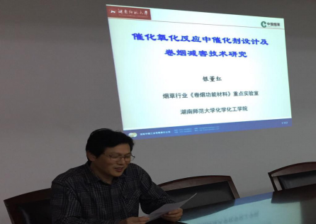 首先,湖南中烟工业有限责任公司高级研发师和烟草行业卷烟功能材料重点实验室副主任银董红教授以“催化氧化反应中催化剂设计及卷烟减害技术研究”为题为我院师生作学术报告,该报告包含烯烃环氧化反应中手性催化剂的设计、硫醚氧化反应中仿生纳米反应器的构筑、卷烟燃吸温度分布与烟气有害成分关系以及实时致孔卷烟纸降CO技术研究等四个方面。其中,最令人印象深刻的是催化剂的设计,这使得在化工产品在商业生产过程中能降低能耗,实现绿色生产。