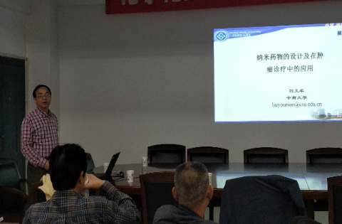 紧接着,中南大学化学化工学院副院长以及功能材料化学研究所所长刘又年教授以“纳米药物的设计及在肿瘤诊疗中的应用”为题。介绍了当前抗肿瘤纳米药物存在的问题如:耐药性差、毒副作用大等,强调研究更优性能药物的重要性。然后向我们讲述为了研究优化药物从而设计出的超薄MnO2纳米片,并且通过更加深入的动物学实验和动力学实验研究出各种可以靶向治疗肿瘤的药物。在治疗肿瘤疾病中有良好的应用前景,为人类健康带来福音。