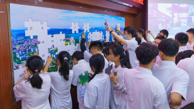 开班仪式上,首批应用化学专业(化妆品方向)学生携手拼起“美丽校园”