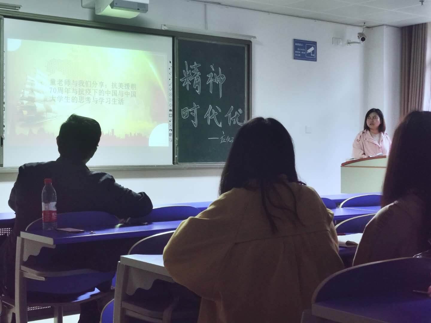 童老师向同学们分享了个人对历史与现实的思考,结合当下抗疫与当年的抗美实情鼓舞同学们“趁年轻,勇敢拼!”强调了当代大学生应该勿忘过去苦难,无愧于当代使命与担当。最后,华老师总结道:“望当代青年能将个人目标与国家繁荣富强、与中国梦紧密相连。”提醒同学们要坚定信念,学习英雄精神,为祖国的未来添光增彩。