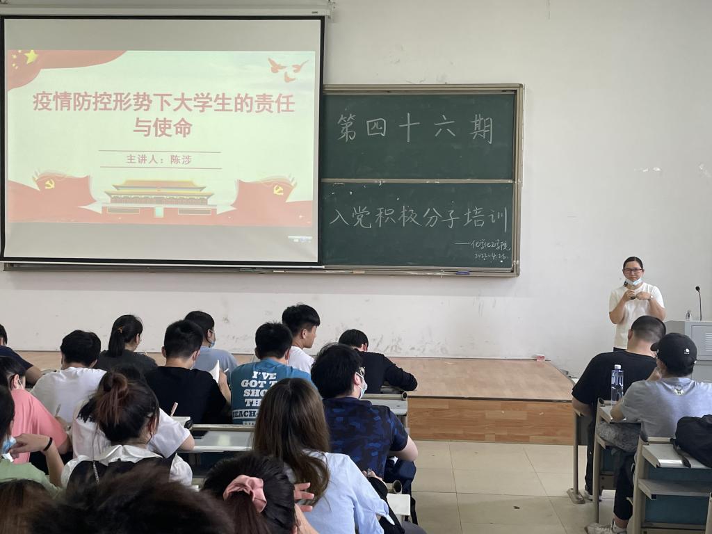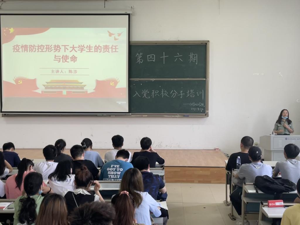 陈涉从“落实疫情防控大学生责任”、“注重树立正确意识形态关”、“中国从站起来到富起来强起来”等几个方面为入党积极分子做了一场精彩的讲座。她明确指出中国现阶段的发展目标和发展方向,同时通过举出经典而又具有启迪性的例子来引导同学们保持正确的价值观,坚定历史使命,提高自身素质,加强实践锻炼与创新能力。她强调:“中华民族迎来了从站起来、富起来到强起来的伟大飞跃,是中国人民奋斗出来的!为崇高理想、远大目标而奋斗的人生,才是有意义的人生,也才是幸福的人生。”