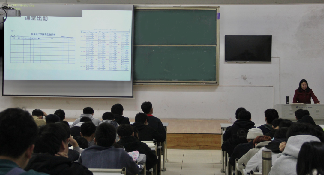 首先,刘晋廷以提问的方式为切入点,引出化工学院学风建设主要由学习部负责,涉及出勤率,旷课记录,课堂秩序等方面。除此之外,为使学勤工作的管理措施更加完备,化工学院设有学业预警制度,根据犯错的严重程度分为四个等级。