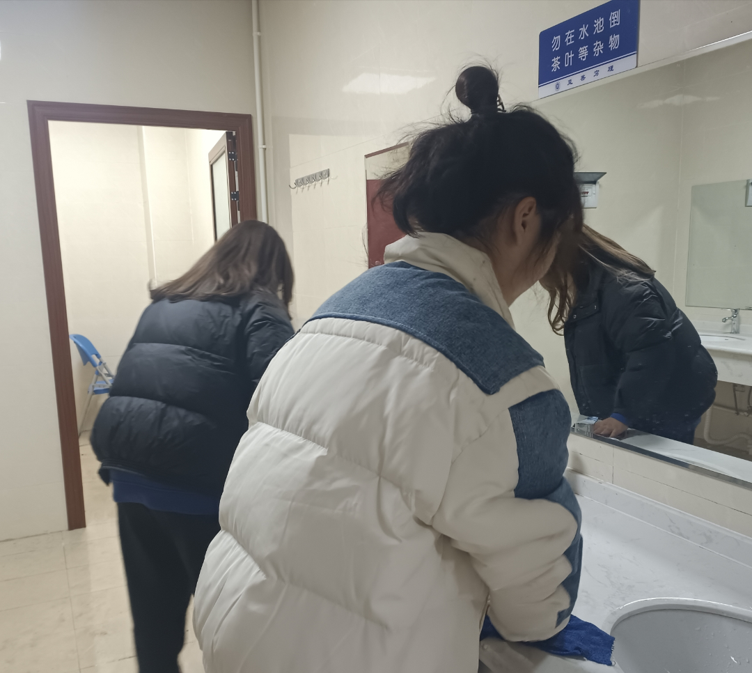 活动过程中,同学们认真负责自己的工作任务,一部分同学清理卫生间的地板与洗手台,一部分同学擦拭走廊旁的窗台,展现出了当代青年热爱劳动,不畏苦累的精神状态。