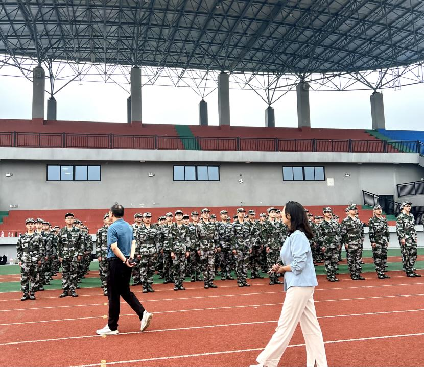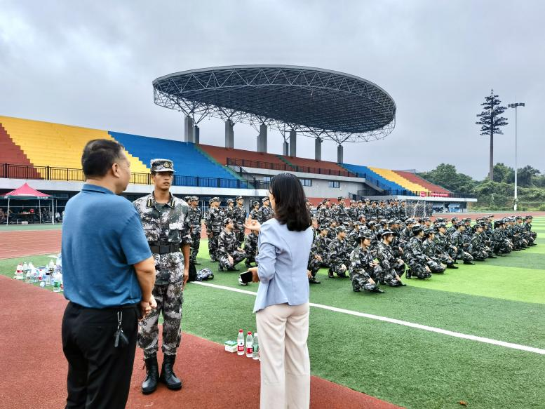 2023年9月12日上午,在学工部班级助理的陪同下,化学化工学院党委书记刘立刚,党委副书记陈涉以及学工办主任王雨晴亲临我校南院田径场,对我院新生的军训情况进行视察,看望并慰问了各连队参训学生以及承训教官。