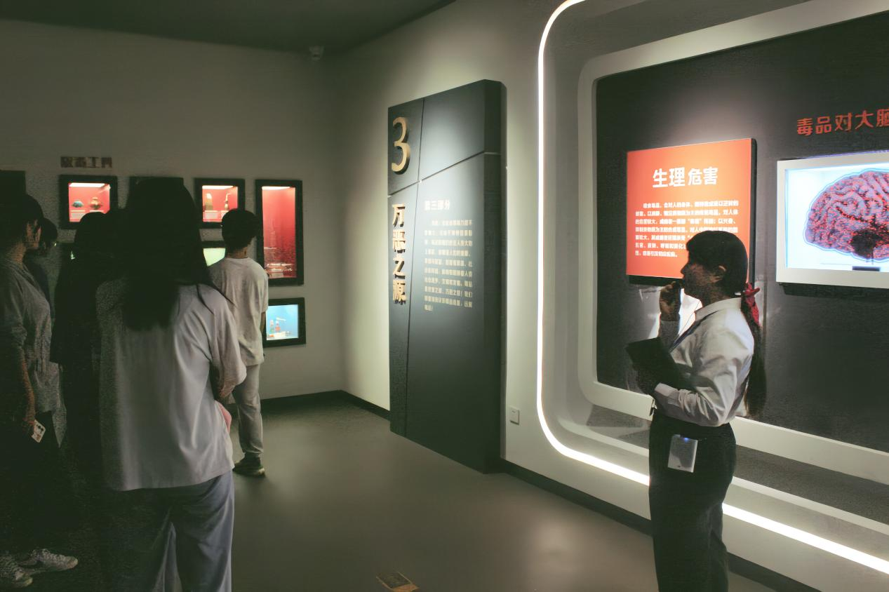 事迹刻写在墙,禁毒牢记于心。跟随戒毒所工作人员走入禁毒基地,墙上镌刻的事迹与数据述说着我国攻坚克难的禁毒历程。在图片中,毒品数量和贩毒人数让人触目惊心,冲锋在前的缉毒警察使人心生敬意。解说下变得生动的事迹,让禁毒的种子在学生心中生根发芽。