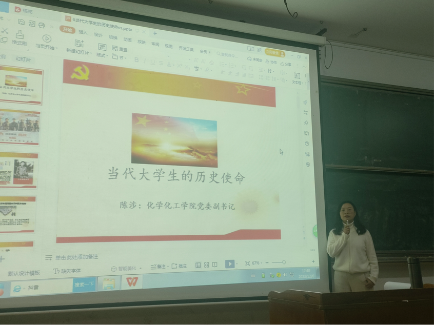 本次党课分为两个部分。首先陈涉书记就“当代大学生的历史使命”为题授课,她强调,我们今日的安逸全因先辈由血肉筑成,当代青年当不仅将“珍惜”二字谨记心底,更要付诸实践,从小事做起,好好做人,不辱先辈之忠烈。