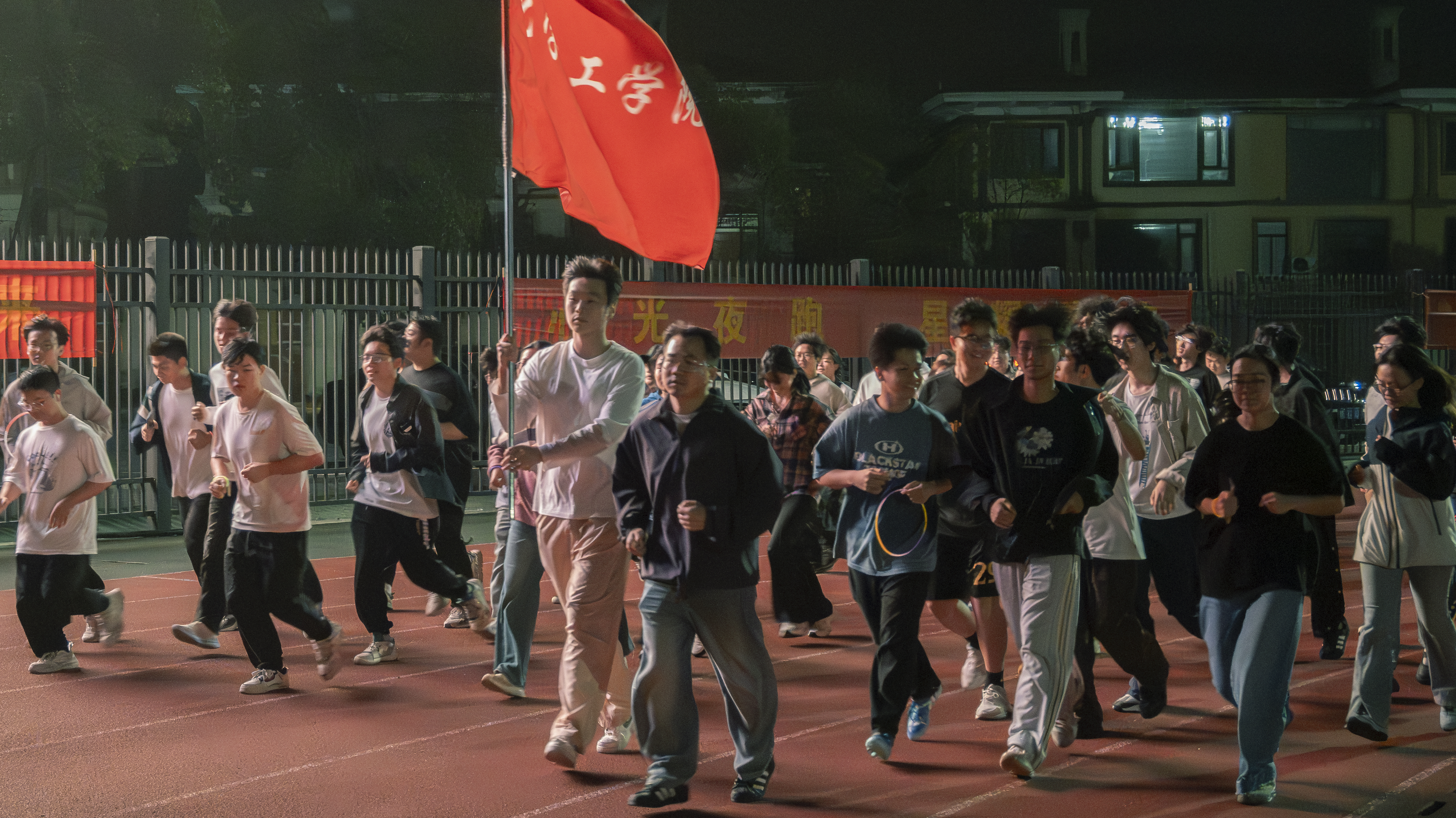 夜幕下的操场被灯光镀上一层暖芒,红色塑胶跑道上,“化学化工学院”字样的鲜红旗帜在夜风里飞扬,成为夜跑队伍最醒目的精神坐标。领跑的同学双手紧攥旗杆,步伐坚定;身后的同学脸上映着灯光的亮泽,脚步轻快又齐整,充分展现了化工学院学子积极向上的精神风貌。