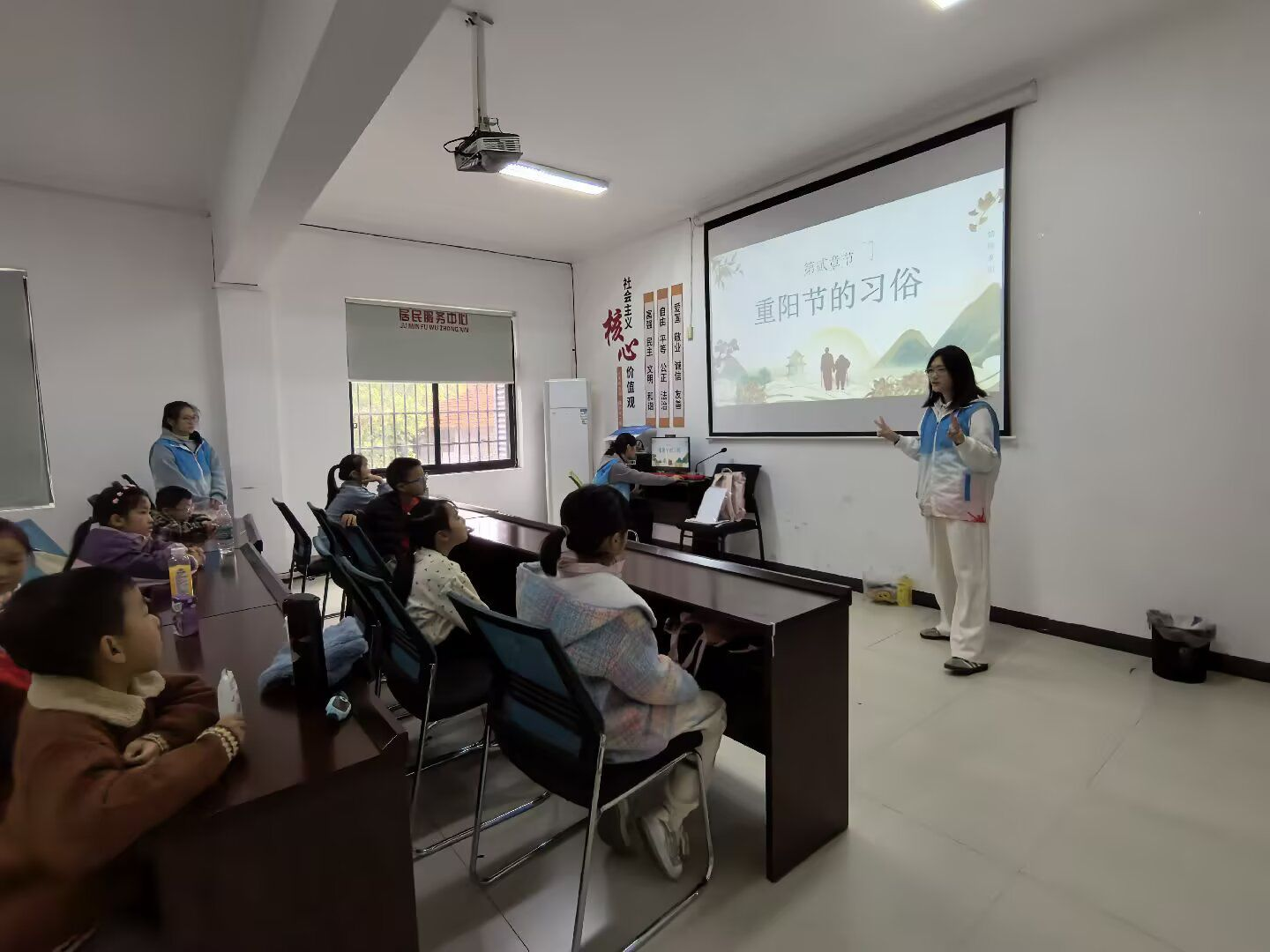 活动伊始,从儿童的节日到老人的节日——重阳节。志愿者以身份为桥,开始了生动的PPT演讲,向孩子们系统讲解重阳节知识。从“九九重阳”的数字寓意,到登高、赏菊、插茱萸的传统习俗,再到“敬老、爱老、孝老”的文化内核,以及孩子们能为长辈做的力所能及的事,还有有趣的猜灯谜环节,志愿者用图片案例将传统节日故事娓娓道来,让孩子们在聆听中读懂重阳节的文化意义。