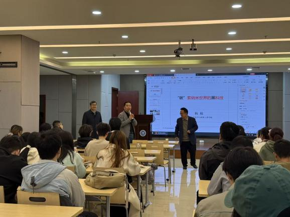 本次讲座上,刘宇副院长首先对杨植教授进行了简要介绍。随后,主讲人杨植教授聚焦碳材料与纳米技术的交叉前沿,从人类文明对微观世界的探索历程出发,系统梳理了碳材料的发展脉络,结合碳纳米管、磷酸铁锂@碳纳米管、硅碳负极@碳纳米管等典型案例,深入浅出地解读了碳基材料如何赋能新能源产业,为现场师生带来了一场兼具科学深度与产业温度的学术盛宴。