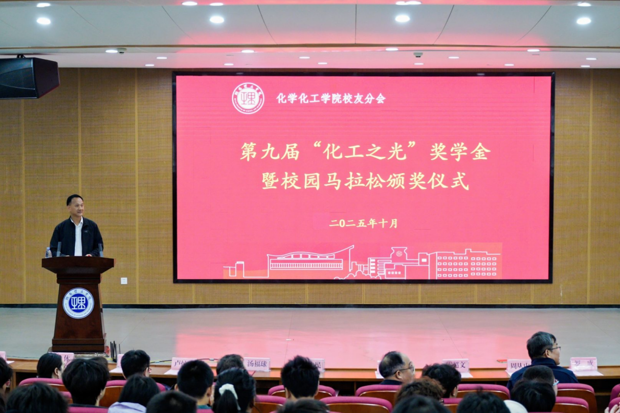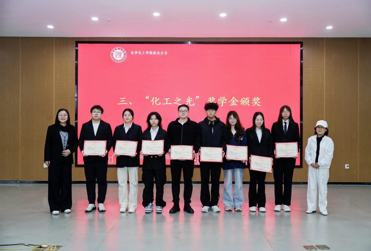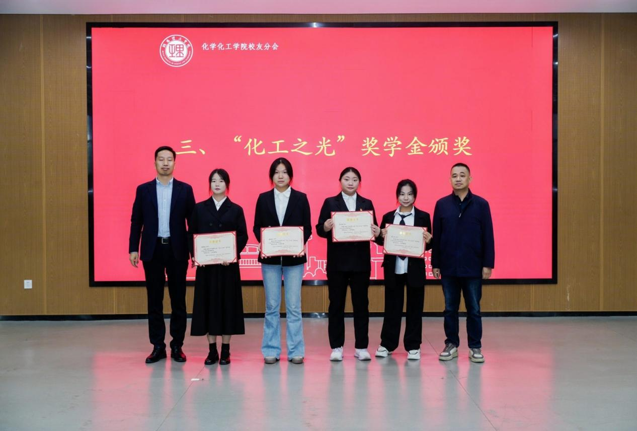 教育基金会理事长汤福球宣读第九届“化工之光”奖学金获奖名单,之后由化学化工学院优秀校友代表为获奖学生颁奖。