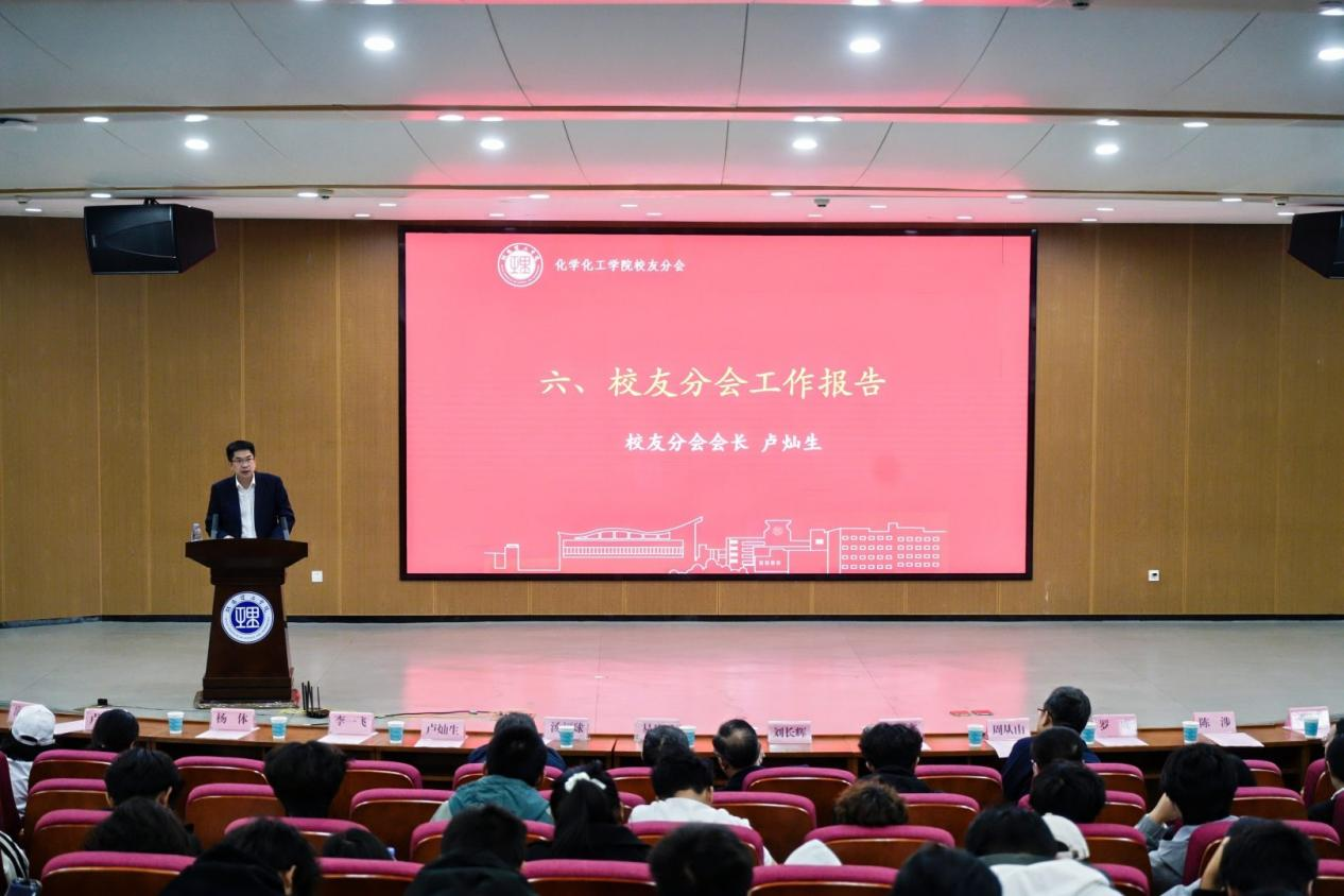 随后,化学化工学院校友分会会长卢灿生作校友分会工作报告,总结了分会过去一年的工作成果,展望了未来加强校友联络、凝聚校友力量、助力母校发展的规划。