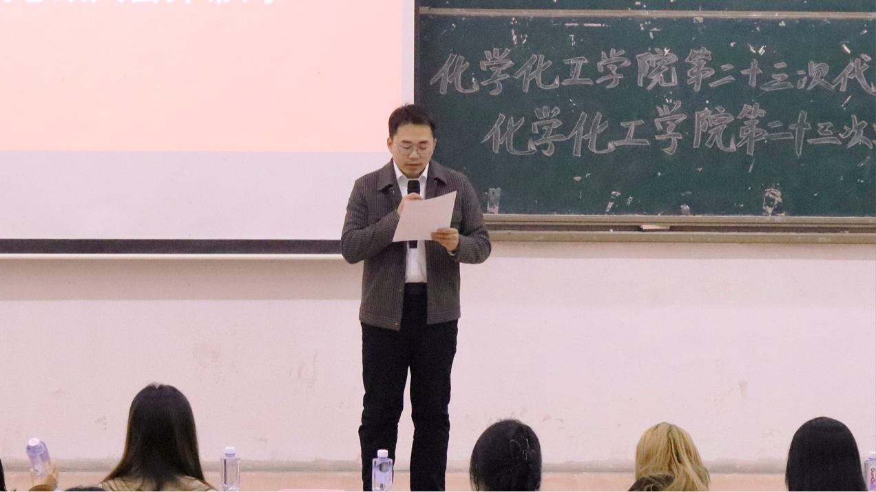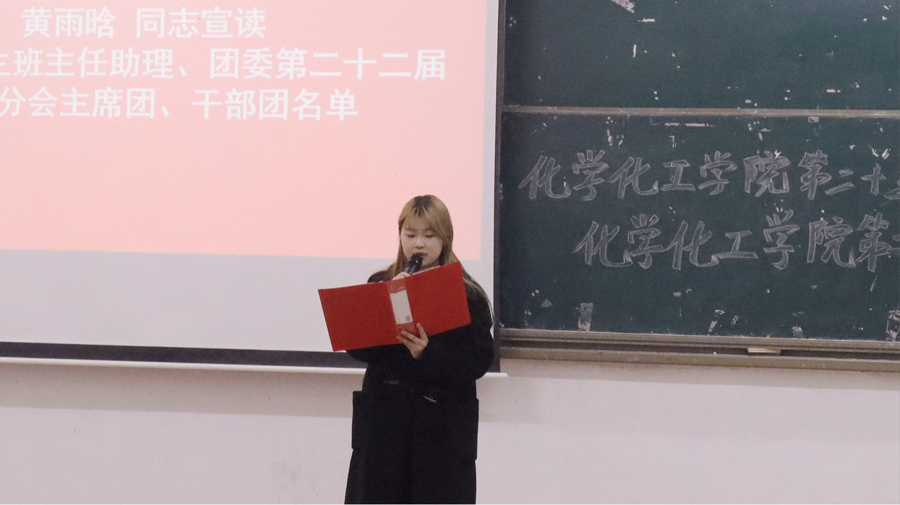 后由唐语轩同志宣读《关于通过湖南理工学院化学化工学院第二十二届委员会工作报告审议》,邓瑶同志宣读《关于通过湖南理工学院化学化工学院第二十二届学生委员会工作报告审议》,黄雨晗同志宣读2024级新生班主任助理、团委第二十二届学生分会主席团、干部团名单。