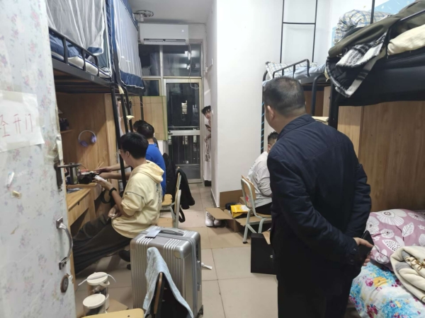 11月26日晚,化学化工学院院长周从山、院党委书记罗成、院党委副书记陈涉带领全体辅导员开展冬季学生宿舍安全检查,排查各类安全隐患,了解晚归外宿情况,开展“倾听心声、护航成长”下寝走访活动。