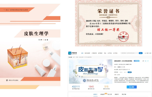 《皮肤生理学》课程的建设成果源于长期扎实的改革积累。刘岸博士团队从课程内容体系入手,2021年主编出版了国内首部《皮肤生理学》教材,填补了该领域空白,并以此为基础,将课程内容系统重构为“皮肤结构”、“皮肤组分”、“皮肤功能”和“皮肤疾病”四大模块,构建起逻辑清晰、交叉融合的知识体系。该教材已被国内多所开设化妆品专业的高校选用,累计销量突破5000册。在资源建设方面,团队自主开发并上线国内首套《皮肤生理学》慕课视频,该课程于2023年获评“湖南省精品在线开放课程”,在全国范围内实现广泛共享。在师资建设方面,团队成员持续参与课程思政教学培训与竞赛,多次荣获包括省级数字化教学竞赛一等奖、省级课程思政教学竞赛三等奖、省级教学创新大赛三等奖等教学比赛在内的奖项。基于本课程的教学成果获评2025年湖南理工学院教学成果一等奖。从而为课程思政的高质量实施提供了坚实保障。